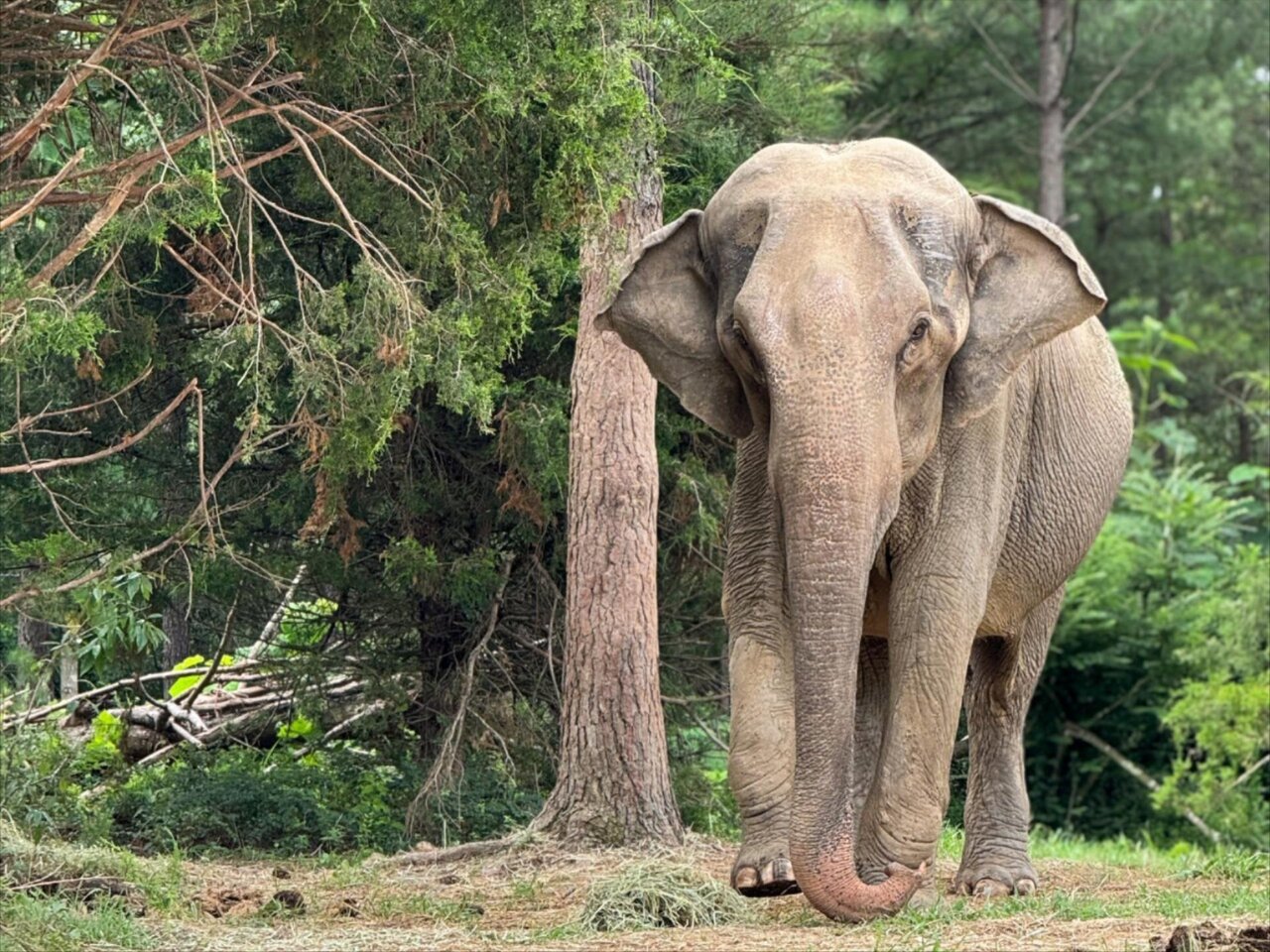 Sissy’s path to The Sanctuary has been long and extraordinary. Captured in Thailand as a calf in 1968, Sissy spent decades in zoos and even survived being submerged during a historic Texas flood, breathing through only her trunk. Upon arrival at The Sanctuary in 2000, Sissy was cautious at first but soon began exploring habitat spaces and forming companionships with other elephants. Over the years, Sissy has shown remarkable resilience—splashing in ponds despite a past observed fear of water, and adapting to life with a partially paralyzed trunk that is still used with great skill to eat, drink, and play.