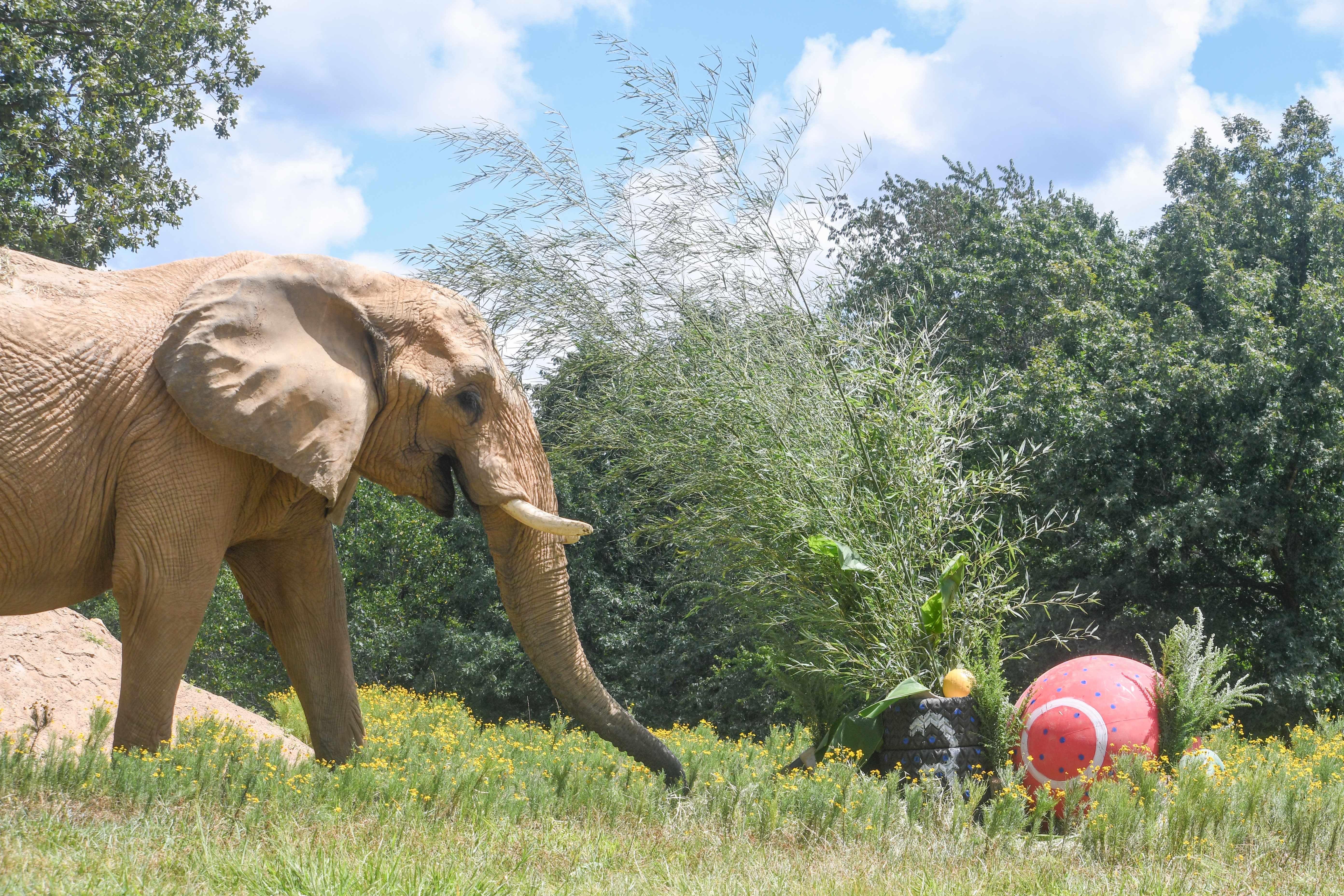 Recently, supporters watching the live EleCams were treated to a familiar and much-loved sight: Flora spending a warm afternoon in the East Valley of Redbud Habitat, confidently navigating a steep hillside while debarking and browsing. Steady against the incline, methodically working at a tree trunk, she embodied what many have come to recognize as classic Flora behavior—independent, focused, and determined. See if you can spot the bobcat in the midst! A variety of different native wildlife shares The Sanctuary's land, and most seem to steer clear of the elephants, posing no safety threat.